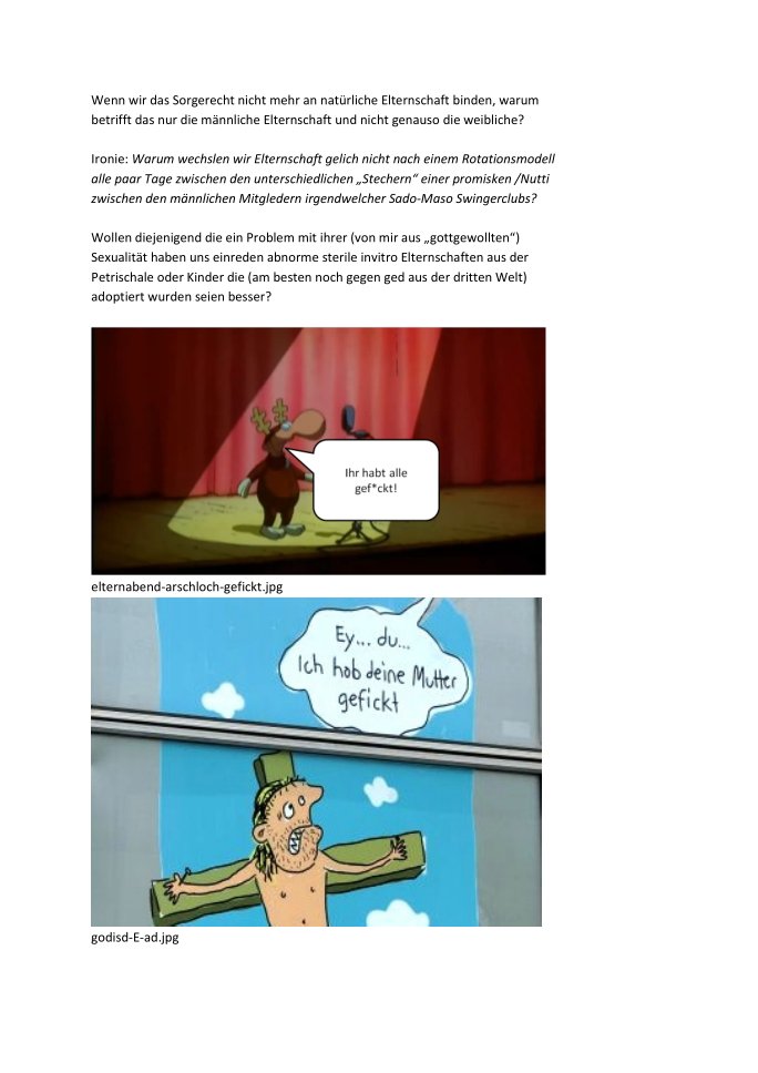 Ironie: Warum wechslen wir Elternschaft gelich nicht nach einem Rotationsmodell alle paar Tage zwischen den unterschiedlichen ?Stechern? einer promisken /Nutti zwischen den männlichen Mitgledern irgendwelcher Sado-Maso Swingerclubs?