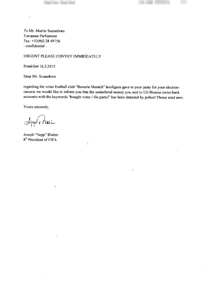 regarding the votes football club ?Bavaria Munich? hooligans gave to your party for your election-success we would like to inform you that the undeclared money you sent to Uli Hoenes swiss bank accounts with the keywords ?bought votes / die partei? has been detected by police! Please send new.